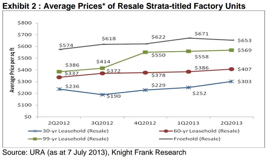 According to Knight Frank, price trends for resale and new sales strata-titled factory units across the different tenures, with the exception of freehold units, exhibited a general upward trend. In the secondary (resale) market, 30-year leasehold factory units increased the most on a q-o-q basis at 20.3 per cent.