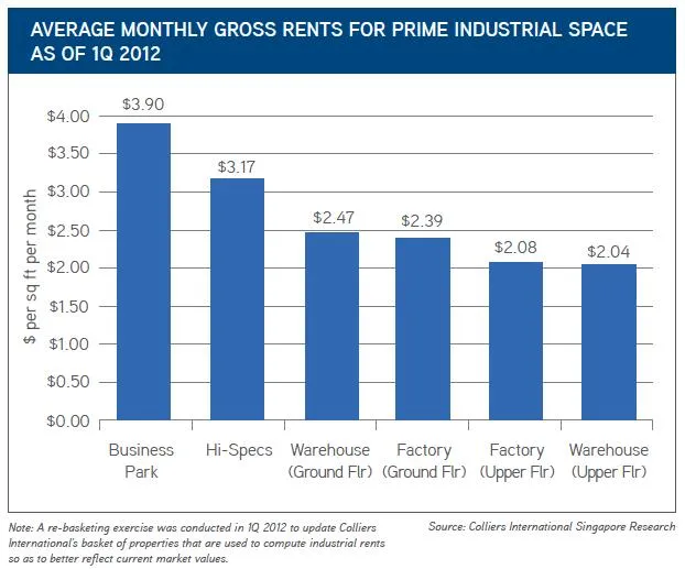 Hence, as of end-March 2012, prime factory space was commanding average monthly gross rents of $2.39 per sq ft for ground floor space and $2.08 per sq ft for upper floor space, while the corresponding rates for warehouses were $2.47 per sq ft and $2.04 per sq ft, respectively.