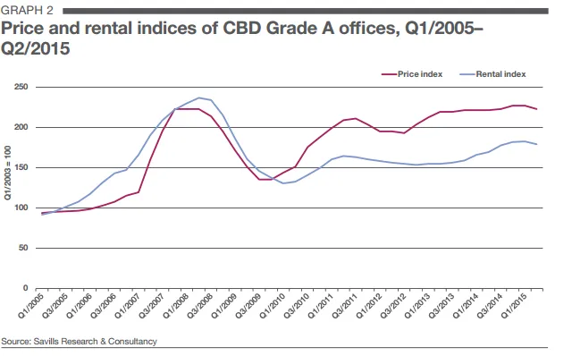 Landlords of prime offices in the Central Business District (CBD) saw rents drop for the first time in over two years in Q2, as leasing enquiries thinned and exisiting tenants downsized.