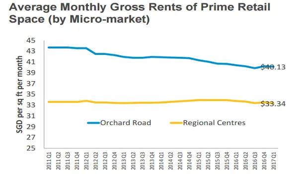 According to this chart from Colliers, average monthly gross retail rent in the Orchard Road fell 0.2% to $40.13 psf, compared to $40.22 psf in the past quarter.