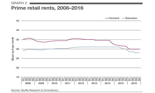 For 4Q16, prime monthly rents for Orchard Road and suburbs remained at $29.90 psf and S$28.00 psf, respectively, similar to their 3Q16 levels. On a year-on-year basis, for 4Q16, both Orchard and suburban rents fell 0.1%.