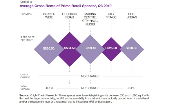 Prime retail rents in the Orchard Road precinct remained unchanged in Q3 2019 at $34.5 psf pm on the back of limited supply, which offset lower tourism spending. The prime units also attracted demand from new-to-market brands that sought greater visibility to consumers, the report added.