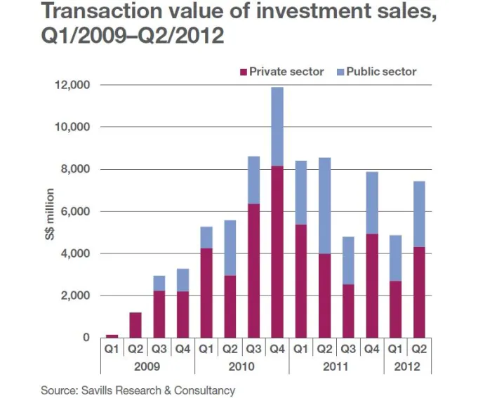There was about S$7.4 billion worth of investment transactions in Q2/2012, representing a 52.4% increase over Q1’s S$4.9 billion, and bringing the total volume in the first half of 2012 to S$12.3 billion.