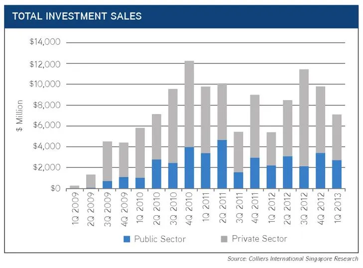 "Total property investment sales value dropped by 27.5% on a quarter-on-quarter (QoQ) basis to $7.11 billion in the first three months of 2013, led by a slowdown in private sector sales which plummeted by 31.4% to $4.38 billion," Colliers said.