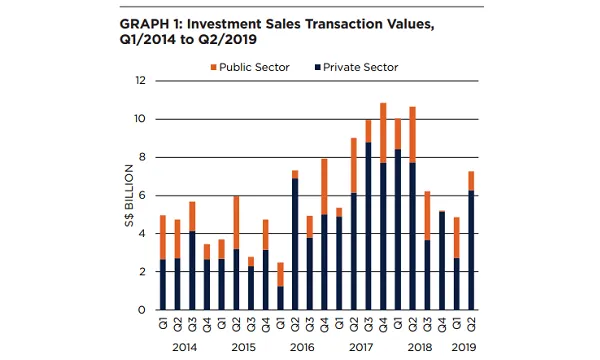 This chart from Savills shows that property investment sales rose 49.2% QoQ to $7.26b in Q2 from $4.98b in Q1.