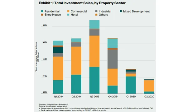 This chart from Knight Frank shows that property investment sales in Q2 totalled $1.7b, signifying a 73.4% YoY plunge from $6.4b in Q2 2019. It also marks a 41.4% QoQ crash from $2.9b in Q1, with no transactions recorded in the public sector.