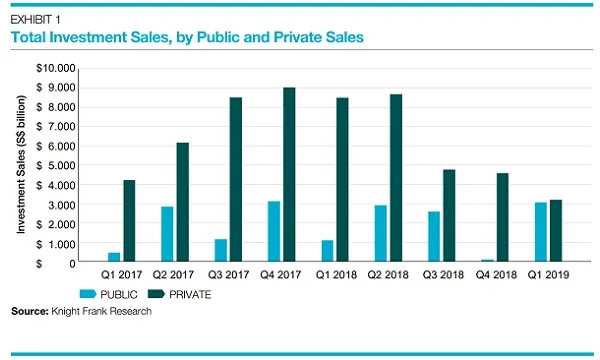 This chart from Knight Frank shows the growth pattern of public and private investment sales on a quarterly basis, with the public property investment sales skyrocketing around 2,718% to $3.1b in Q1 from $110m in Q4 2018.