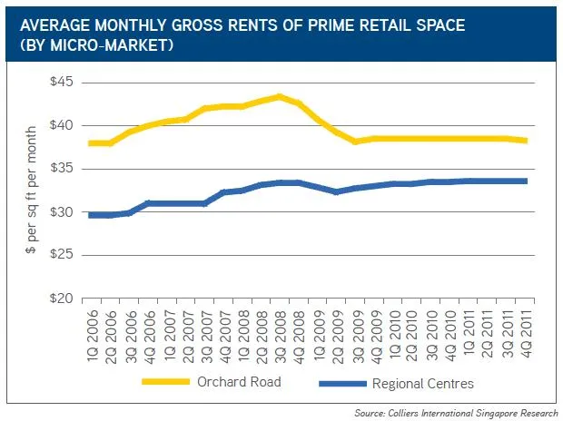 Continued interest from retail and F&B operators in suburban malls which enjoy the advantage of an immediate captive catchment population, provided support for rents to increase in 1Q 2012. As of the end of March, the average monthly gross rent of prime space in Regional Centres inched up by 0.6% QoQ to reach $33.80 per sq ft per month, after remaining unchanged for three consecutive quarters.