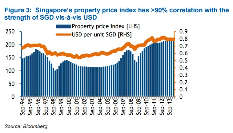 This chart from RHB Research shows that Singapore property prices have a 90% correlation with the strength of the Singapore dollar versus the greenback.