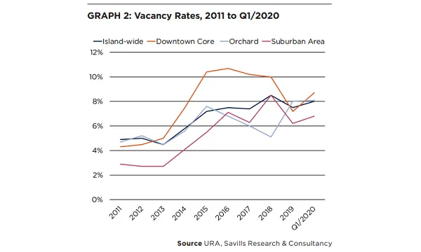 This chart from Savills shows that the island-wide vacancy rate amongst retail properties rose to 8% in Q1 from 7.4% in Q4 2019, despite a decline in retail supply.