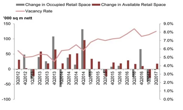 As a result, the island-wide vacancy rate of retail space rose to 8.1% at the end of 2Q17, from 7.7% at the end of the previous quarter.