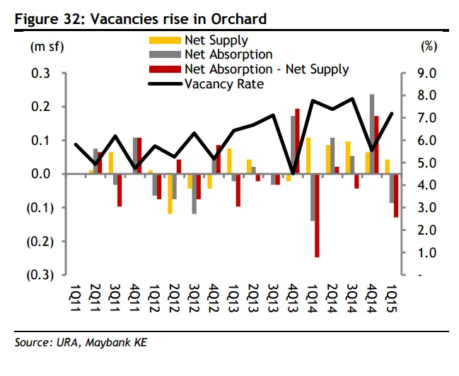 There were more unoccupied retail spots along Orchard Road in the first quarter, according to this chart from Maybank Kim Eng.
