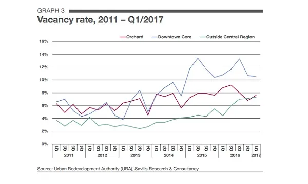 Following a rebound in the previous quarter, the vacancy rate in Orchard Planning Area and rest of Central Area worsened by 0.8 ppts QoQ to 7.6% and 7.7% respectively in 1Q17.