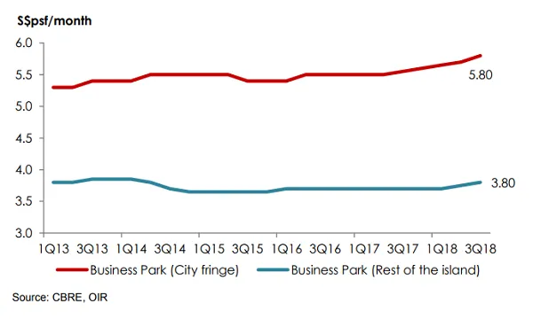 Rents for business parks in the city fringe increased 1.8% QoQ to $5.80 psf per month in Q3 after five consecutive quarters of growth, whilst for those in the rest of the island, rents inched up 1.3% QoQ to $3.80 psf per month.