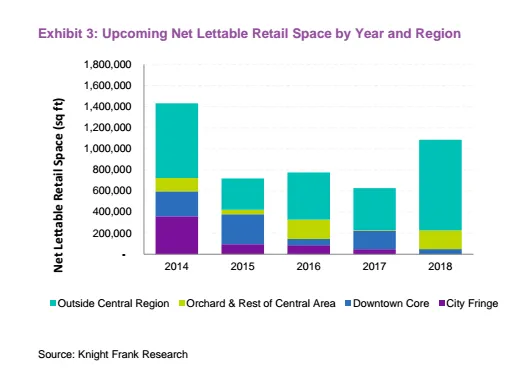 Other upcoming suburban retail spaces over the next four years include Big Box, The Seletar Mall, Eastpoint Mall, Hillion Mall, Waterway Point, and Changi Airport Terminal 4.