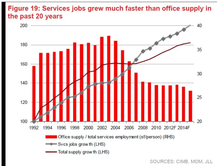 All these will inevitably drive demand for office space. To meet these needs, the government plans to add more office supply in centralised Marina Bay (another 1m sq m of office space, up from the current 6m sq m) and decentralised areas like Jurong Lake (500k sq m of office space), One-North and Paya Lebar Central.