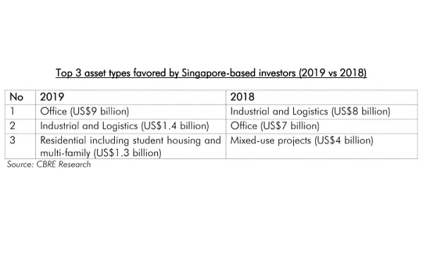 This chart from CBRE reveals that office properties were the most favoured asset type by Singapore-based investors in 2019, garnering $12.45b (US$9b) in deals. It is followed by industrial and logistics properties $1.94b (US$1.4b) and residential properties $1.8b (US$1.3b).