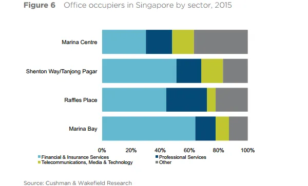 In particular, the Marina Bay Area—with its prime waterfront location, high specification, column-free structure, and emergency back-up facilities—in particular presents an alluring space as it was purposefully built to support Singapore’s target of being a global financial and business hub. This is reflected in the immense proportion of financial sector occupiers (64%) in Marina Bay, including DBS, Citigroup, and Standard Chartered.