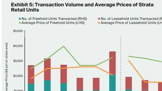 This chart from Knight Frank shows the transaction volume of strata retail spaces from the number of freehold and leasehold units showing signs of a major recovery after a fall during 2020 and 2021.