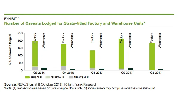 Total strata-titled factory resale transactions fell by 9.0% QoQ to 183 resale caveats in Q3 2017, and a 7.6% YoY increase from 170 resale caveats in Q3 2016.