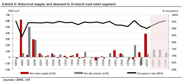 Given the limited pipeline, we forecast an under-supply in the Orchard retail segment from 2015F to 2017F, driving occupancy rates from 95.8% as at end 2013 to 97.2% as at end 2017F.