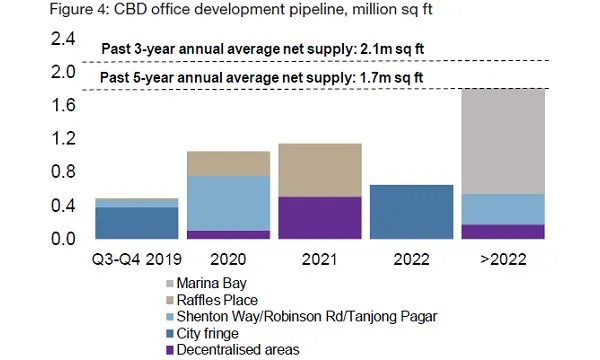 This chart from Edmund Tie & Co. (ET&Co) shows that the office supply pipeline in the CBD area will amount to 3.3 million sqft from Q3 2019 to 2022, with Marina Bay accounting for most of its stock.
