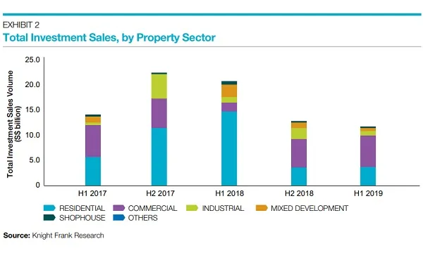 This chart from Knight Frank shows that the total property investment sales dipped 9.5% to $11.4b in H1 from $12.6b in H2 2018, which was attributed to the decline in industrial investment sales to $874.6m in the same period from $2.2b in H2 2018.