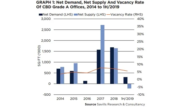 There were no new completions of CBD grade A office space in Q2, whilst net demand was about 376,000 sqft during the same period.