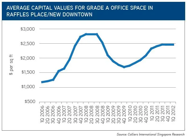 According to Colliers International, the average capital value of Grade A office space in the Raffles Place/New Downtown area held firm for the second consecutive quarter at $2,459 per sq ft in 1Q 2012.