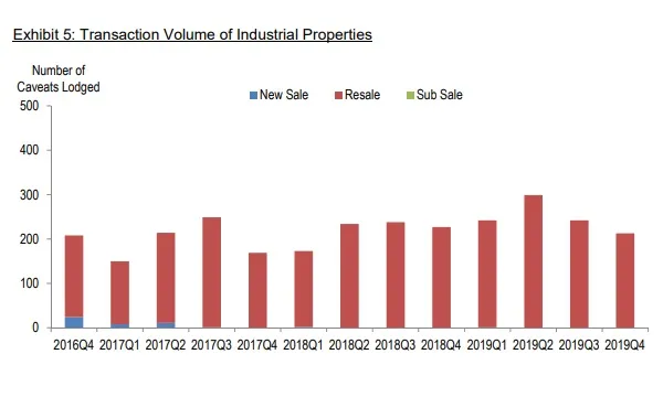 This chart from JTC Corporation revealed that the volume of industrial properties transacted based on the number of caveats lodged was estimated to have fallen 12% QoQ in Q4 2019. On a yearly basis, it dropped 6% YoY.