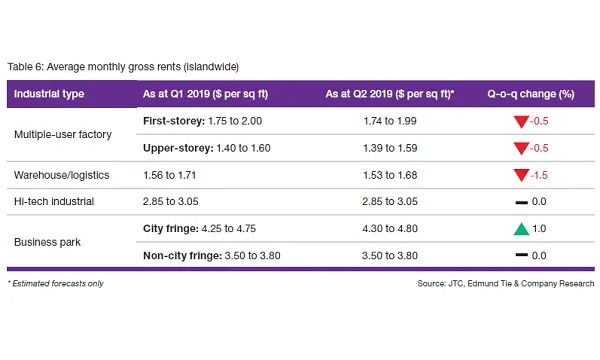 Leasing costs for first-storey and upper-storey multi-user factories also slipped 0.5%. Rents for hi-tech industrial facilities and non-city fringe business parks remained flat in Q2. Only city-fringe business parks saw rents increase by 1% in the same period to $4.30-$4.80 psf from $4.25-$4.75 psf in Q1.