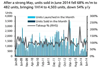 Sale for June brought the sales for 1H14 to 4,503 units, down 54% from 9,841 units for 1H13. We estimate that The Crest was priced 7% below its expected pricing level of S$1,800psf, but we note that it still did not do well. Certain projects, such as The Panorama,for which selling prices have been brought down by about 10% since its launch in January, also continued to see tepid sales with the total take-up at 29%. We believe this shows the severity of the slowdown since the TDSR framework was imposed in June 2013. Based on the runrate, we estimate that private new home sales could be headed for a full-year take-up of 9,000 units for 2014, which would be a decline of 40% from 14,948 units for 2013 and a drop of 59% from 22,197 units for 2012.