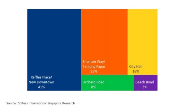 This chart from Colliers International shows that the highest concentration of flexible workspaces in the central business district (CBD) are in the area of Raffles Place/New Downtown which houses 41% of flexible workspace footprint in the CBD.