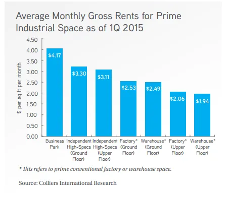 According to a report by Colliers International, the average monthly gross rents of ground-level prime conventional factory space, which are limited in supply and typically more sought after, stayed flat at $2.53 per sq ft as of 1Q 2015, after easing by 1.6% QoQ in 4Q 2014.