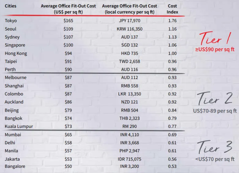 Tokyo leads the regional rankings with average fit out costs of US$165 psf (JPY17,970) as construction costs compete with the forthcoming Olympics coupled by an ageing labour market is pushing costs up.