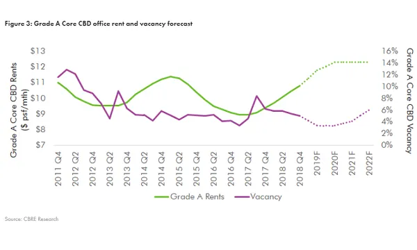 Grade A office rents is projected to maintain an upward trajectory from 2019 to 2022, though more slowly compared to the early part of the rental recovery cycle, CBRE Research reported.