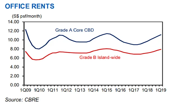 Grade A office rents edged up 3.2% QoQ to $11.15 psf pm in Q1 2019 as supply tapered off in the core Central Business District (CBD), a report by UOB Kay Hian (UOBKH) revealed.