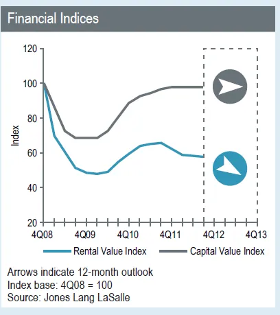 According to Jones Lang LaSalle, demand remained muted, with activity dominated by renewals and relocations but with limited expansions in 3Q12. New demand continued to be thin under the current market conditions, although positive net absorption was recorded during the quarter due to relocation demand.