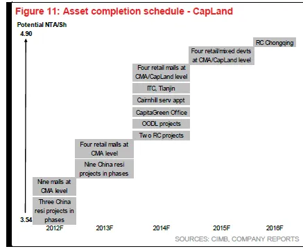"Asset recycling is likely to remain their growth theme in FY13, particularly for developers with established REIT platforms. We believe developers are in an advantageous position given compressed REIT yields and elevated capital values. Development capex committed in the past may start to bear fruit in FY13-14 which should lift developers’ NTA. Developers with large development pipelines in 2013-15 include UOL, GLP, CMA and CapLand," it said in a report.