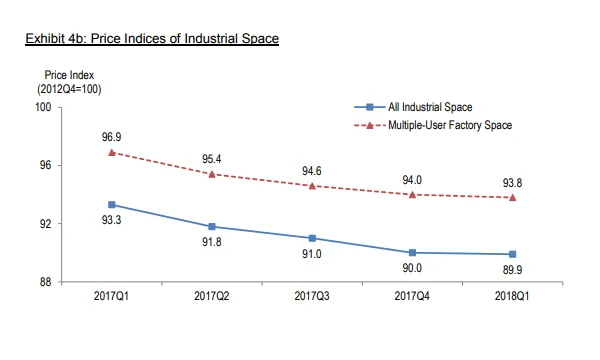 According to JTC, the prices and rentals of industrial space remained relatively stable. Property prices dipped 3.6%, whilst rents fell 2%. Multiple-user factory space prices fell 3.2%.