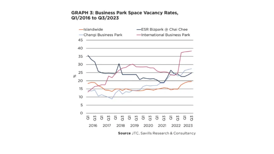 The real estate expert added that the vacancy level in Changi Business Park also increased by 0.5 ppt QoQ to a record high of 27.4% in Q3.