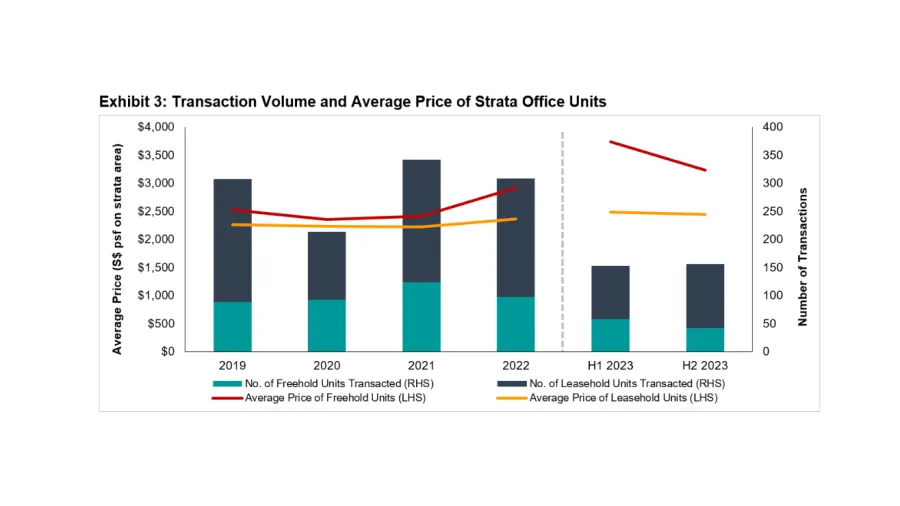 One hundred fourteen (114) leasehold properties changed hands in H2 2023, whilst there were only 42 freehold strata office transactions during the period.