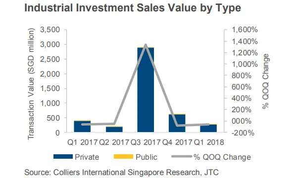 The total private industrial investment sales value dipped 56.2% QoQ and 29.5% YoY to $273.5m (US$209m). "The largest transaction in the quarter was Cache Logistics Trust's sale of 40 Alps Ave to a property fund for $73.8m or $239 psf per GFA. ESR-REIT, AIMS AMP Capital Industrial REIT and Sabana REIT also divested properties during Q1 2018," Song added.