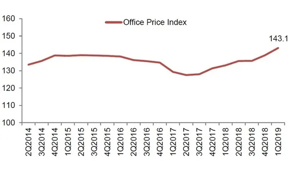 As at the end of Q1 2019, there was a total supply of about 733,000 sqm gross floor area (GFA) of office space in the pipeline, compared with the 732,000 sqm GFA of office space in the pipeline in the previous quarter.