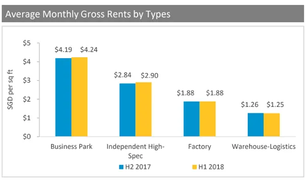 Meanwhile, average gross rents of logistics properties slipped by 0.8% HoH to $1.25 psf due to the supply influx in 2017.