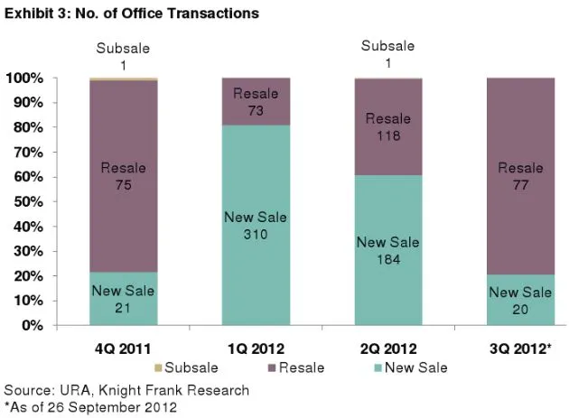Over the first 6 months this year, new strata offices made up 72 per cent of all 686 transactions. In 3Q 2012 however, the tables have turned and resale offices in the secondary market is seeing a marked increase in market share. As of 26 September 2012, resale offices constitute 79 per cent of the total 97 transactions.