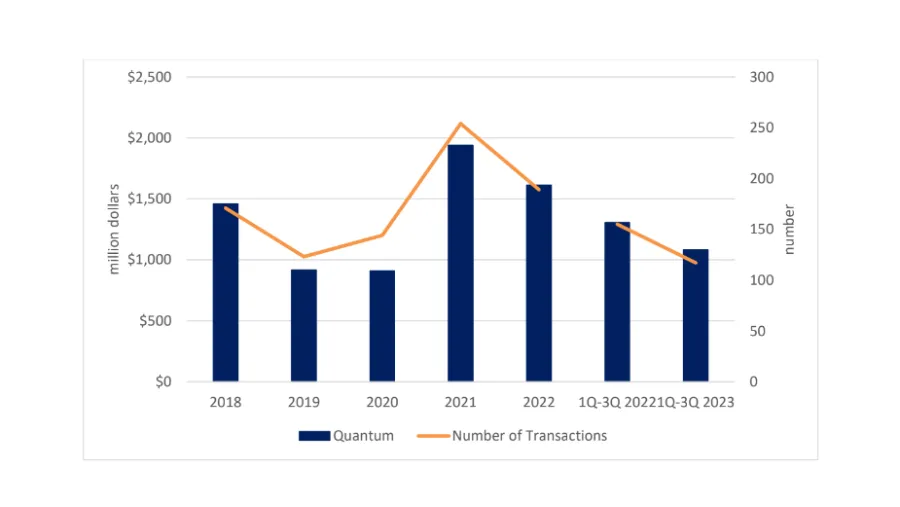 In 9M23, 117 shophouses were sold. In the same period, transaction value fell 17.1% YoY to $1.1b from $1.3b in 9M22.