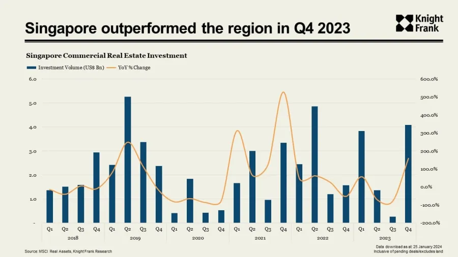 According to Knight Frank, Singapore’s commercial investment volume in 4Q23 was its highest quarterly figure in five years.