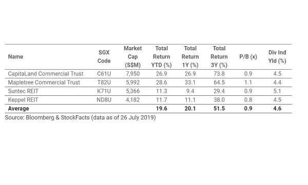 The four companies, which include CapitaLand Commercial Trust, Mapletree Commercial Trust, Suntec REIT and Keppel REIT, averaged a price-to-book ratio of 0.9x and a dividend indicated yield of 4.6%. Mapletree Commercial Trust emerged as the strongest performer with YTD returns of 28.6%, followed by CapitaLand Commercial Trust at 26.9%.