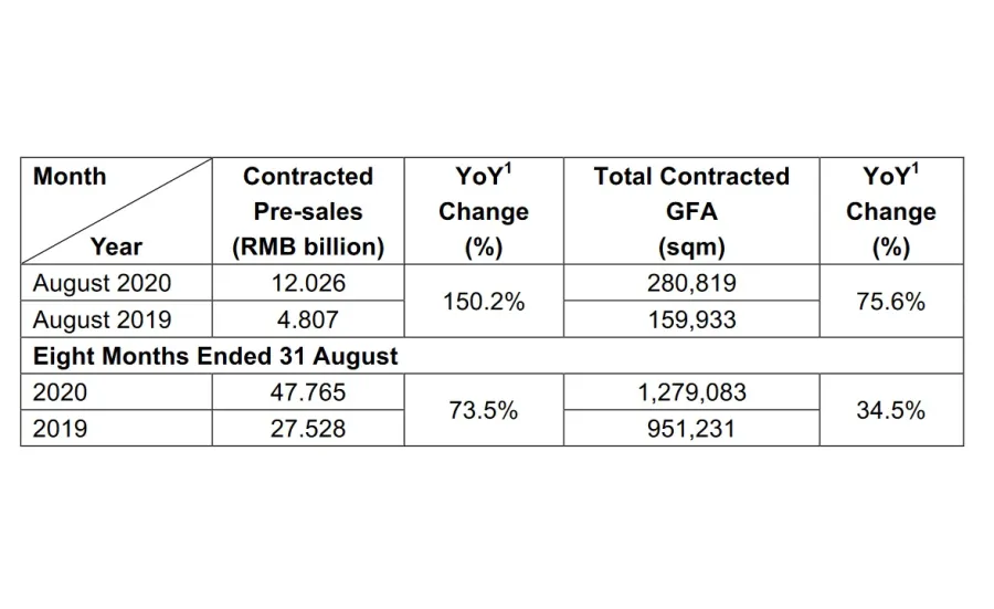 Its total contracted presales rose 73.5% in the first eight months of 2020.